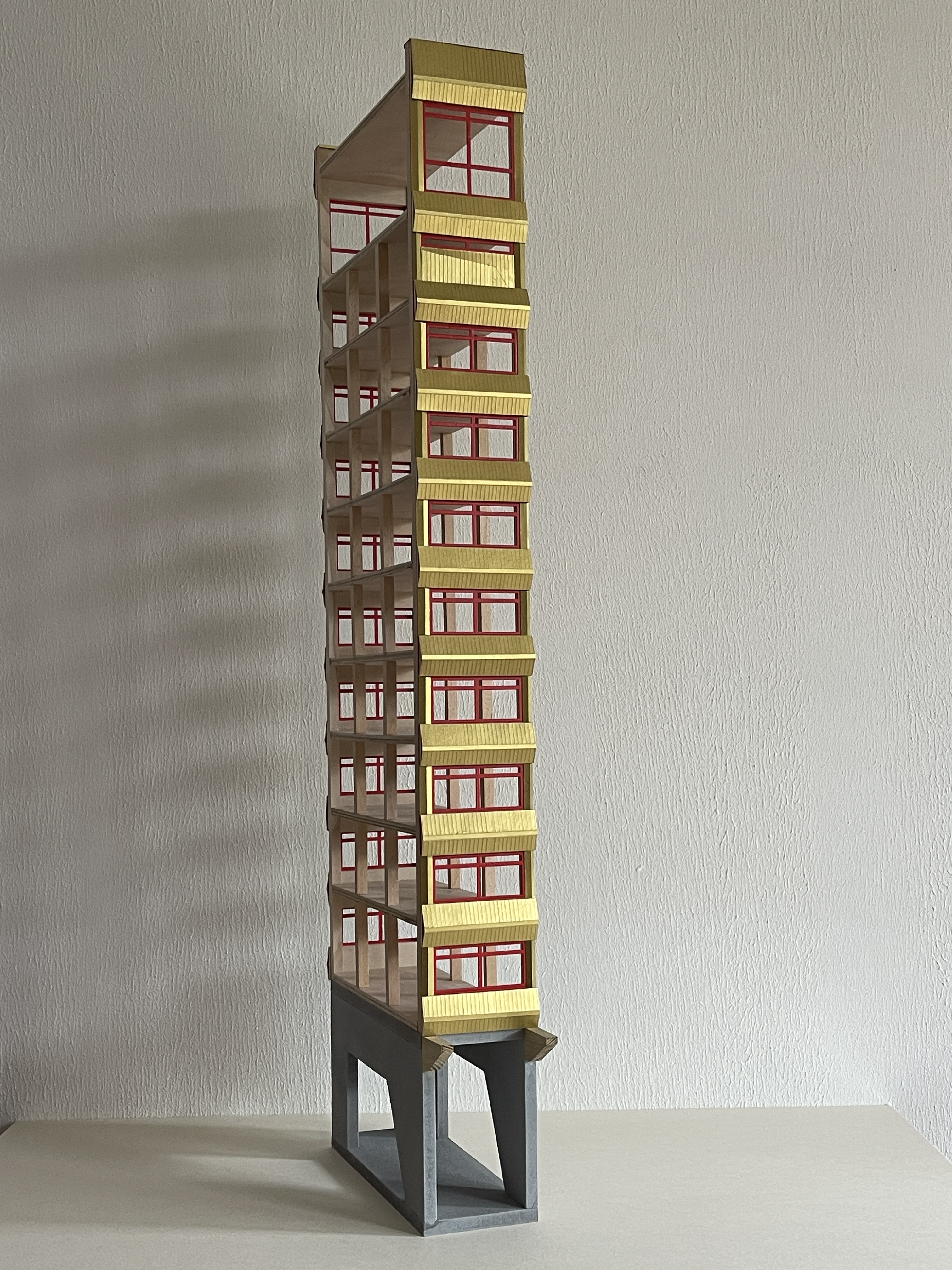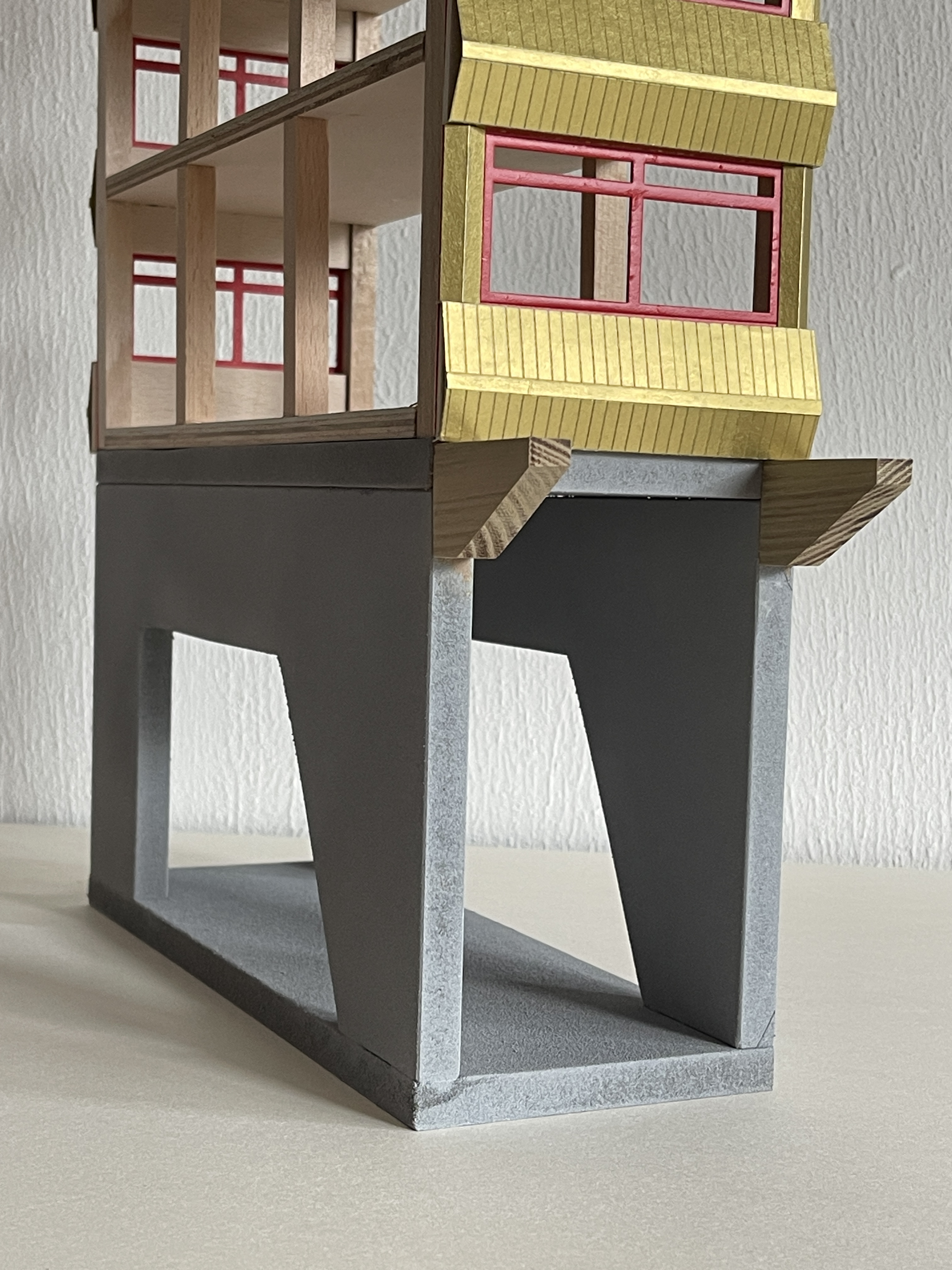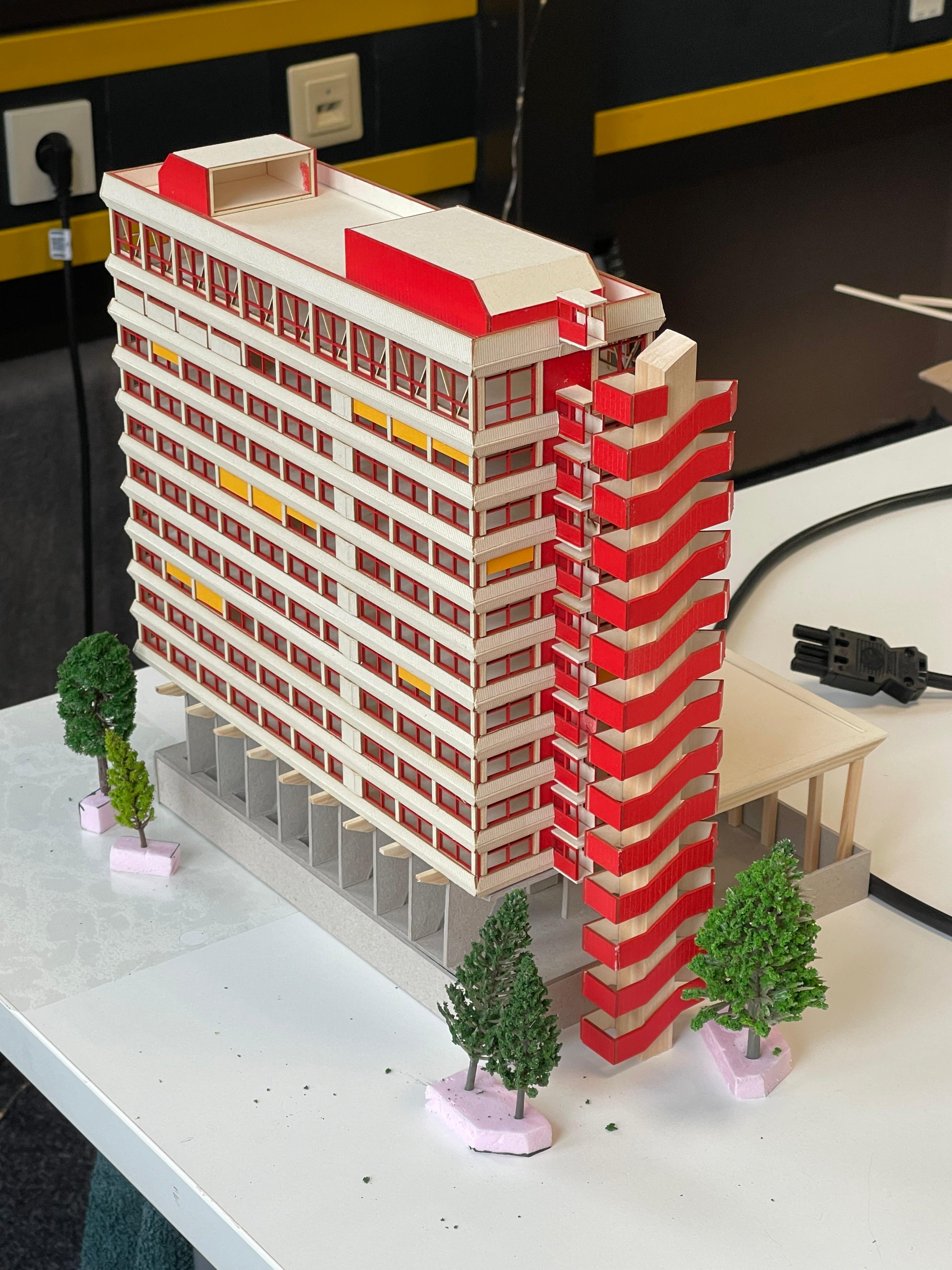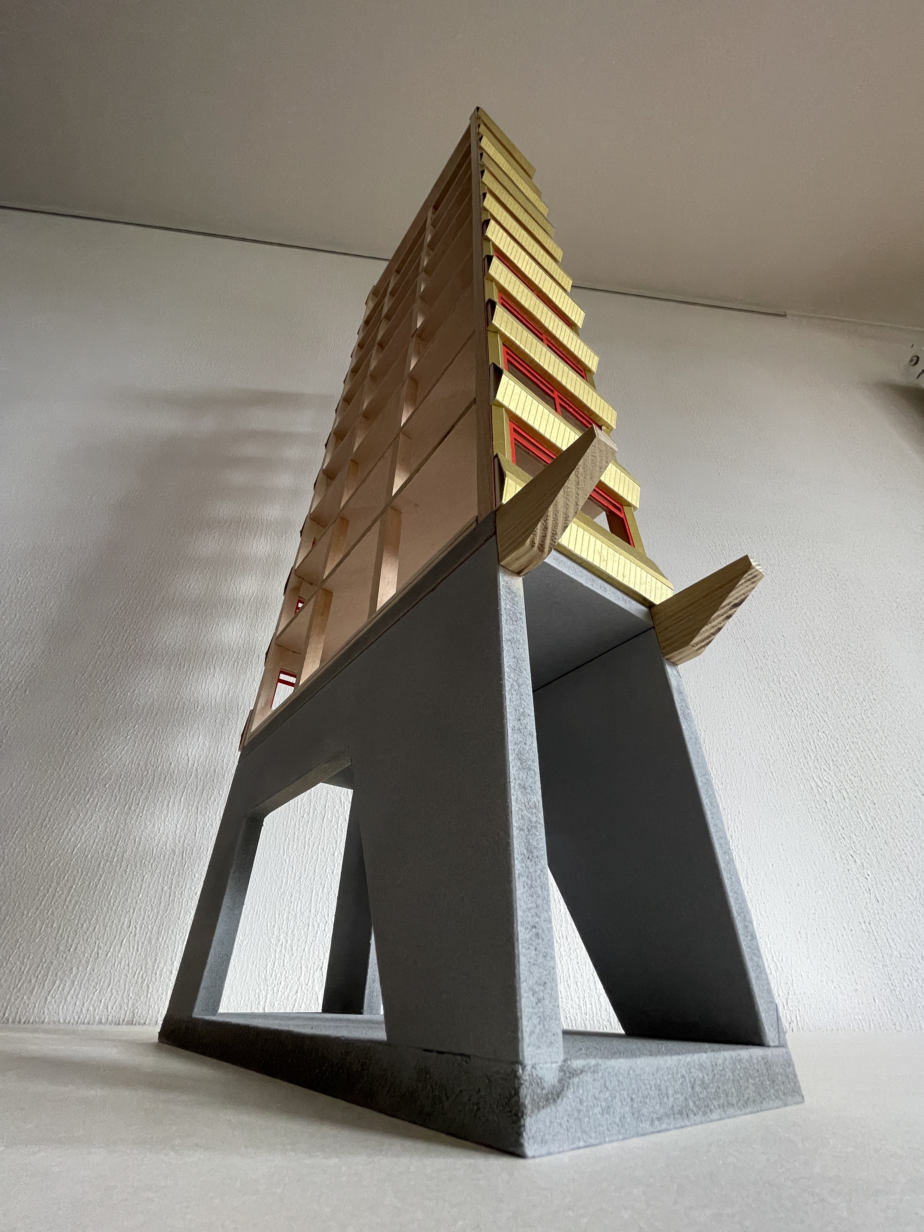 eine schule wird in mainz kastell am rheinufer gebaut. das hochhaus mit stahlbeton tragwerk und brettsperrholz wänden bietet beim lernen einen blick auf die containerschiffe, die kräne, ein naturschutzgebiet, ein weizenfeld und die stadt. das gebäude erhebt sich auf stelzen über die sporthalle und hat ein schwimmbecken im erdgeschoss