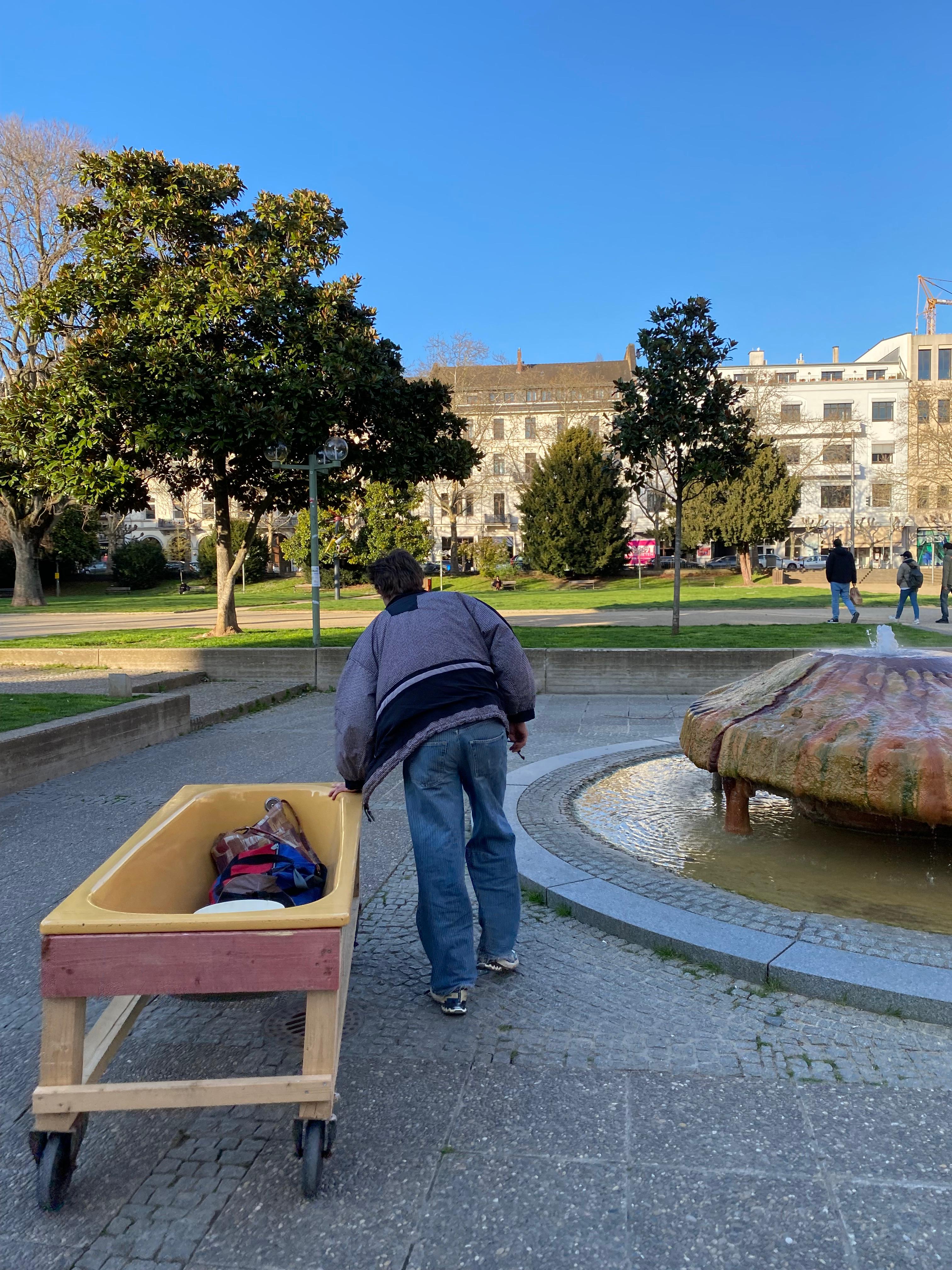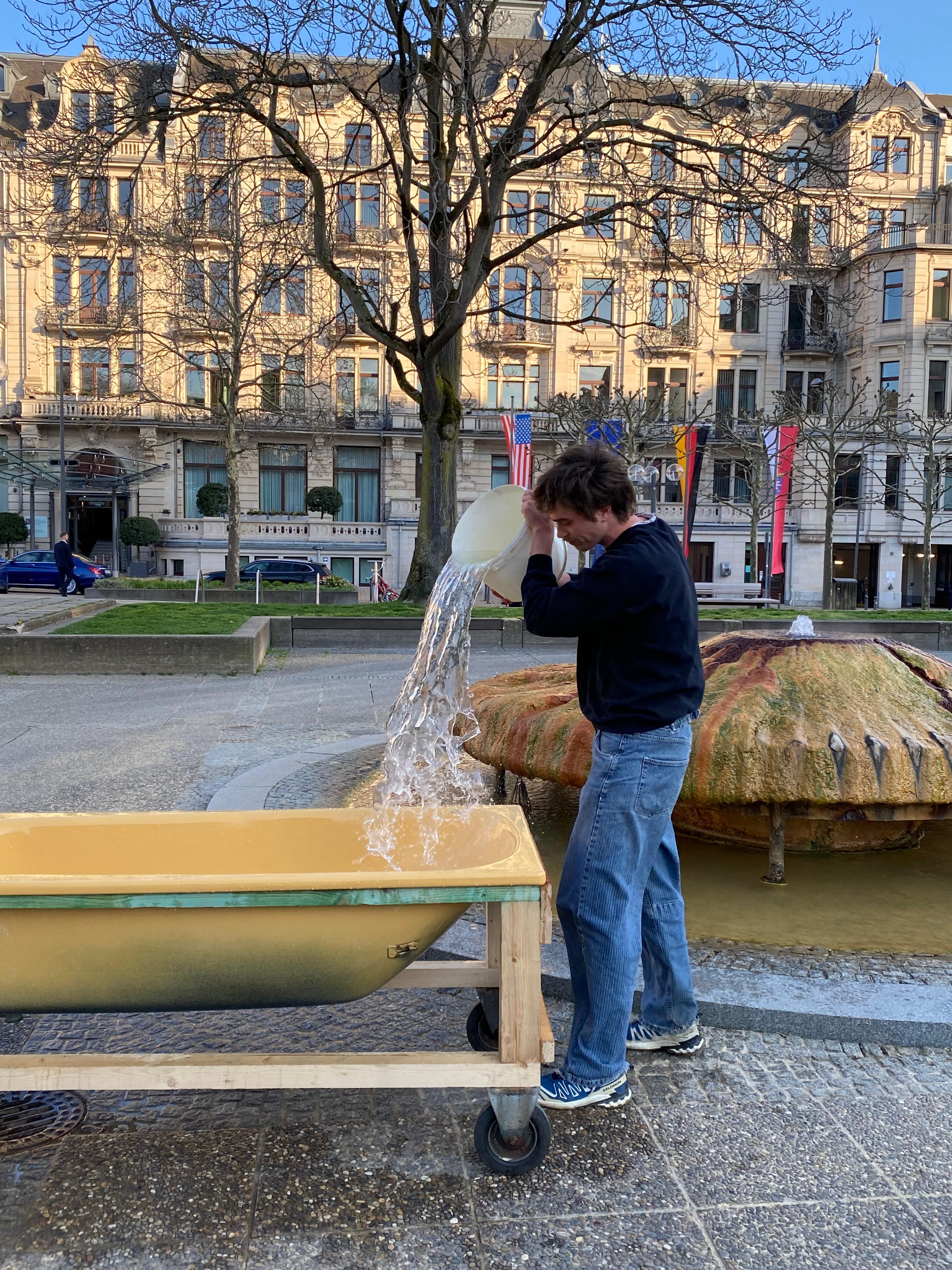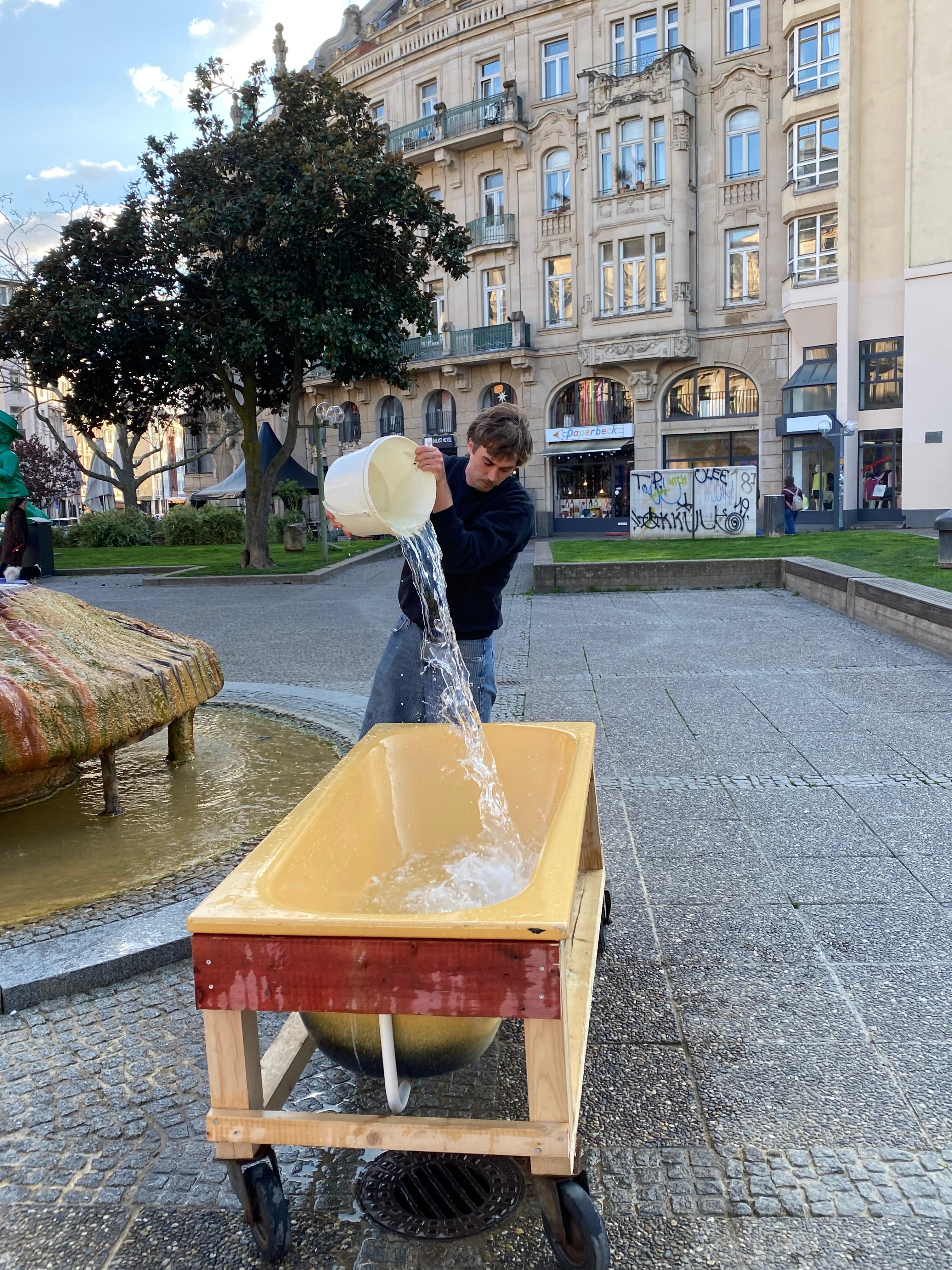 IN UNSEREM SCHÖNEN WIESBADEN GIBT ES 36 heiße quellen geothermischen ursprungs. den autofahrern zuliebe wurde ein großteil der wiesbadener gewässer in die kanalisation geleitet. der kochbrunnen sprudelt 60° heißes thermalwasser tag für tag vor sich hin und wartet auf eine gruppe architekturschaffender mit einer rollenden badewanne die an kalten wintertagen im heißen thermalwasser baden